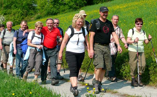 Die Anfahrt führte 16 Wanderer/-innen vom Wasserturm nach Steinkirchen im Kochertal. Dort wartete bereits die erste Überraschung: Wanderführer Egon hatte heißen Kaffee und frische Butterbrezeln vorbereitet. Gestärkt ging es auf dem Kochertal-Radweg zu Fuß Richtung Kocherstetten. Von nun an gings bergauf. Eine schweißtreibende Steigung führte hoch zum Altersruhesitz Schloß Stetten. Hier fielen insbesondere die von bekannten internationalen Persönlichkeiten gespendeten Bäume auf. Nach einer kurzen Rast ging es auf einem idyllischen Trampelpfad und einer Bachüberquerung weiter nach Vogelsberg. Nach einem weiteren Ab- und Auftstieg gelangten wir nach Tierberg wo Schafe genüsslich in einer Löwenzahnwiese weideten. Über Winterberg ging es hinunter ins Tal, vorbei an Sommerberg und Weilersbach zurück zum Ausgangspunkt. Hier gab es die zweite Überraschung: Susi hatte Getränke vorbereitet und Egon hatte in weiser Voraussicht sogar gekühlte Tannenzäpfen im Auto. Den gebührenden Abschluß fand die gelungene Maiwanderung im Löwen in Braunsbach bei üppigen Portionen und vielseitigen Speisen. Allerdings war der Schreck groß als anstelle der erwarteten Halben Hefe nur 2 cl serviert wurden, was sich aber schnell als Maistreich der wortgewandten Bedienung herausstellte. Und so fuhren alle wieder glücklich und zufrieden nach Wallhausen.