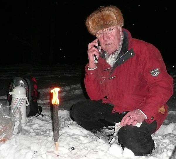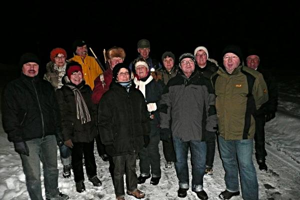 Bei ungewöhnlich viel Neuschnee sind 16 wackere Freizeitler am Samstagabend vom Rathaus Wallhausen losgezogen. Bereits nach der Abzweigung zum Drachenwald nach der Eisenbahnbrücke wurde uns das sehr deutlich: 30 cm Schneehöhe, und niemand hatte für uns geräumt. Doch wir hatten etwas Glück, kurz vor dem Ende des Drachenwaldes sind wir links abgebogen und konnten in einer Bulldogspur laufen. Bei der ersten Pause hat Reisleiter Egon heißen Amaretto mit Sahne serviert. Anschließend ging es quer über ein verschneites Feld, da wo im Sommer ein schöner Feldweg Richtung Mistlau führt. Wieder im Wald freuten wir uns über die Spur eines Offroaders, aber durch die schmalen Reifen konnten wir immer nur einen Fuß vor den anderen setzen und das Ganze ist dann in eine langezogene Gleichgewichtsübgung ausgeartet.